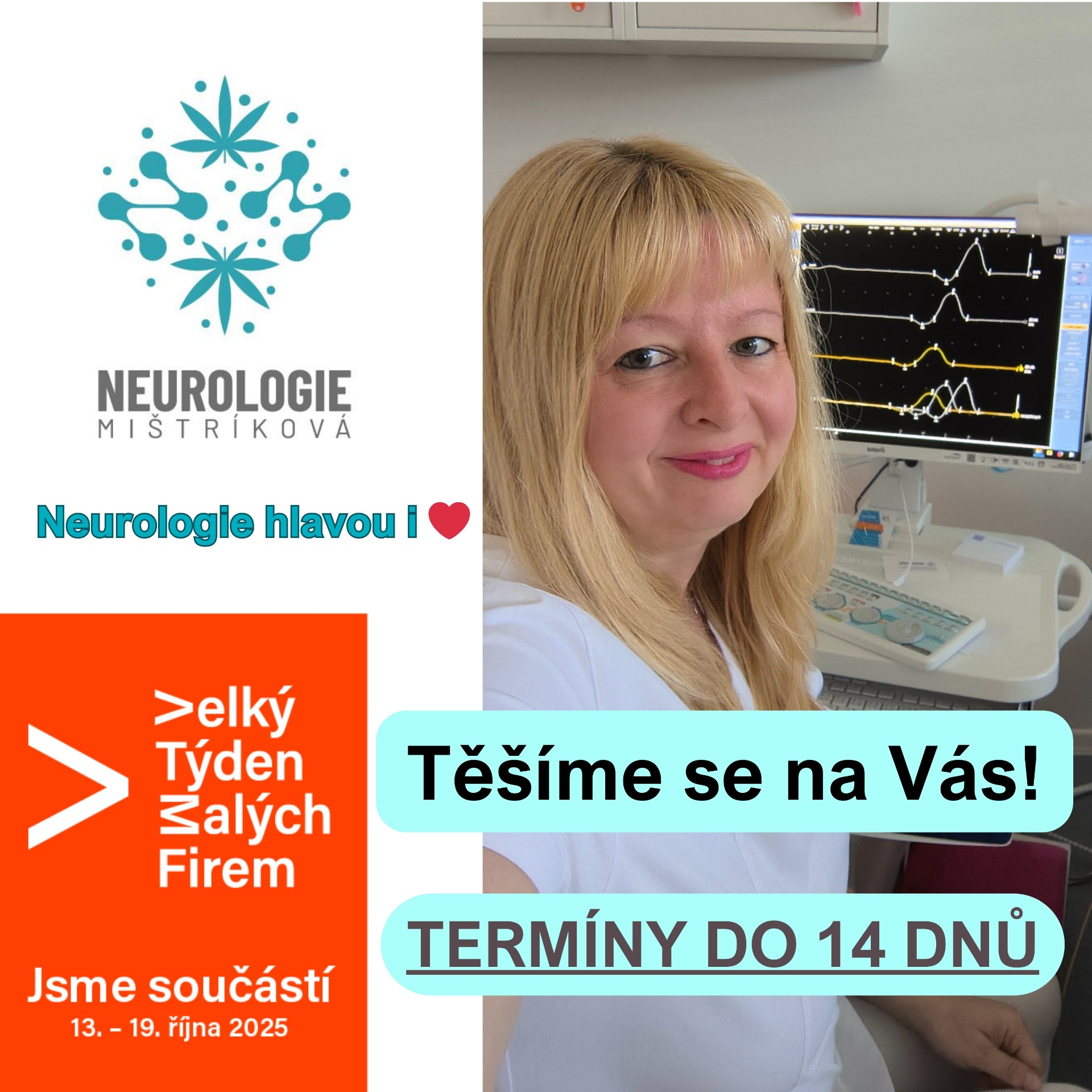 Termíny k 1. vyšetření jsou k dispozici do 14 dní, abyste mohli co nejdříve získat potřebnou odbornou diagnostiku a racionální léčbu s individuálním léčebným plánem.