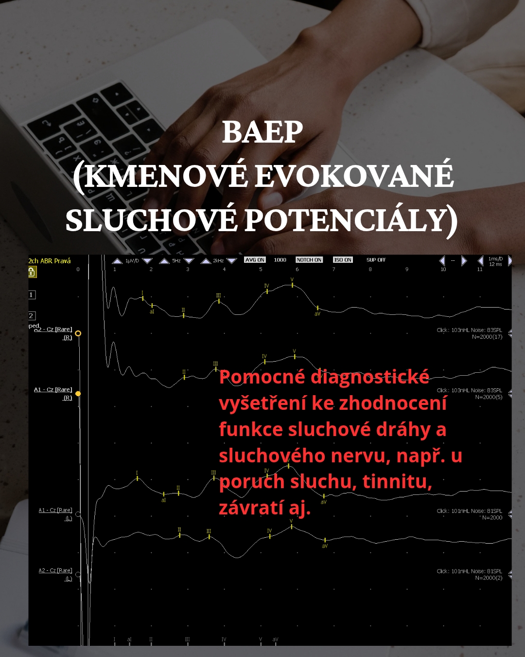 neboli sluchové evokované potenciály (různé zkratky: BAER, BERA). Vyšetření slouží jako pomocná metoda k posouzení možného postižení sluchové dráhy. BAEP vyšetření provádí vyškolená zdravotní sestra.